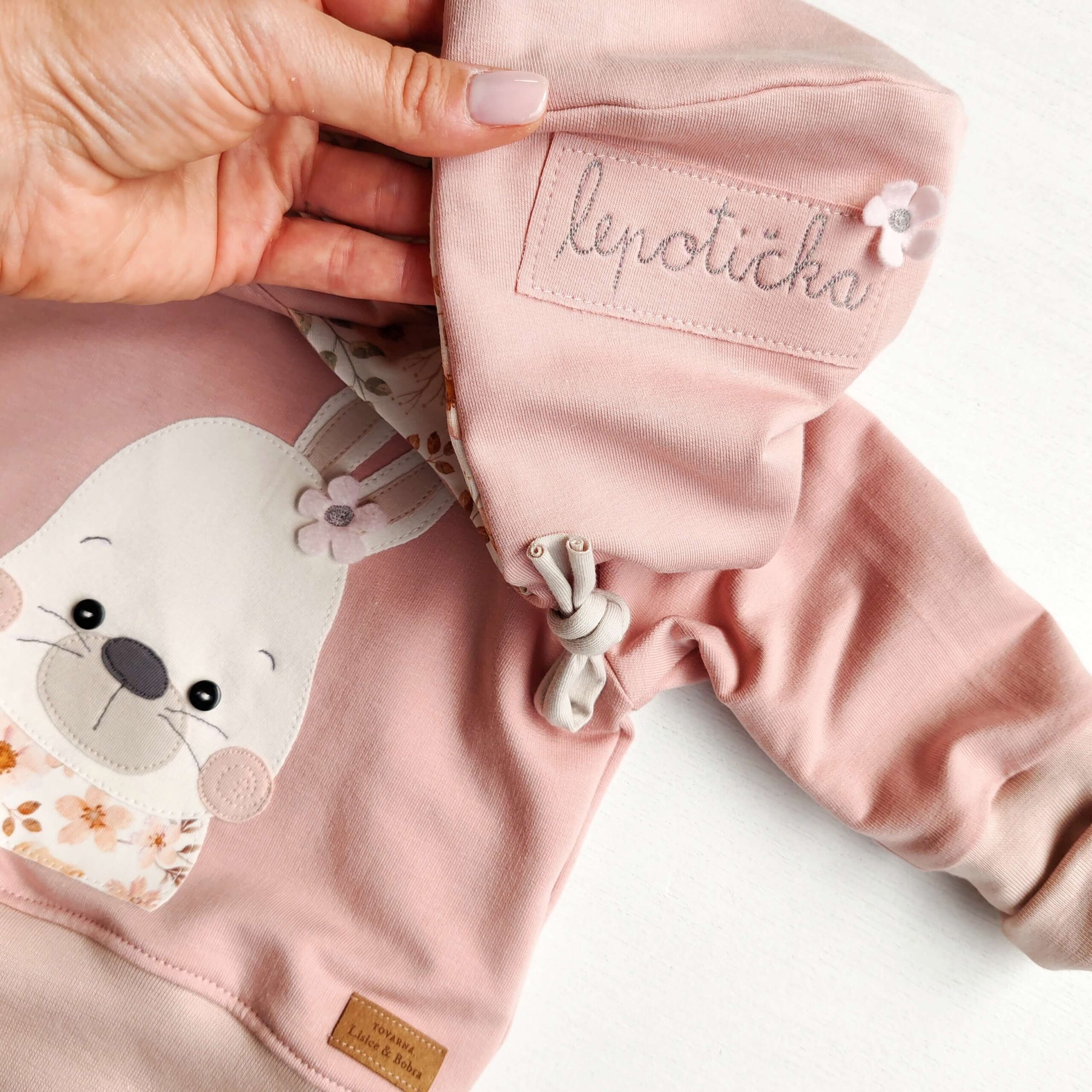 – prostoročno zašit napis ”lepotička” in aplikacija rožice na kapuci