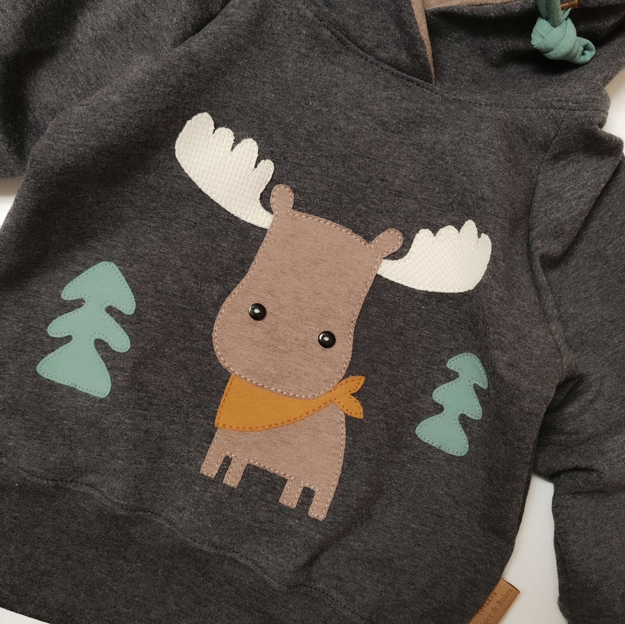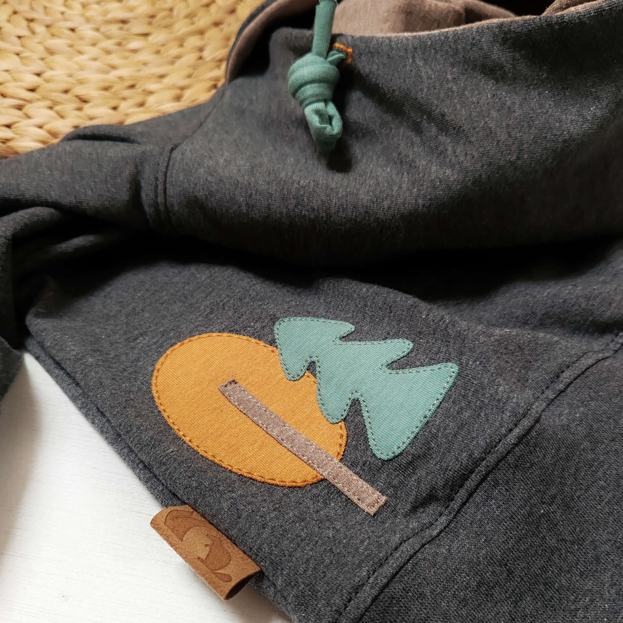 Ali motiv losa lahko izpade ljubko? Ja, seveda lahko! Super ljubko! Dodala sva mu še drevesa, tokrat tudi na hrbtno stran kapucarja. Ker malo pa mora biti spešl. 🙂