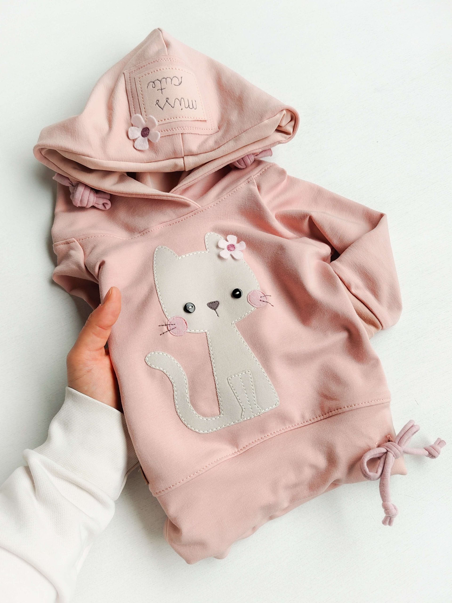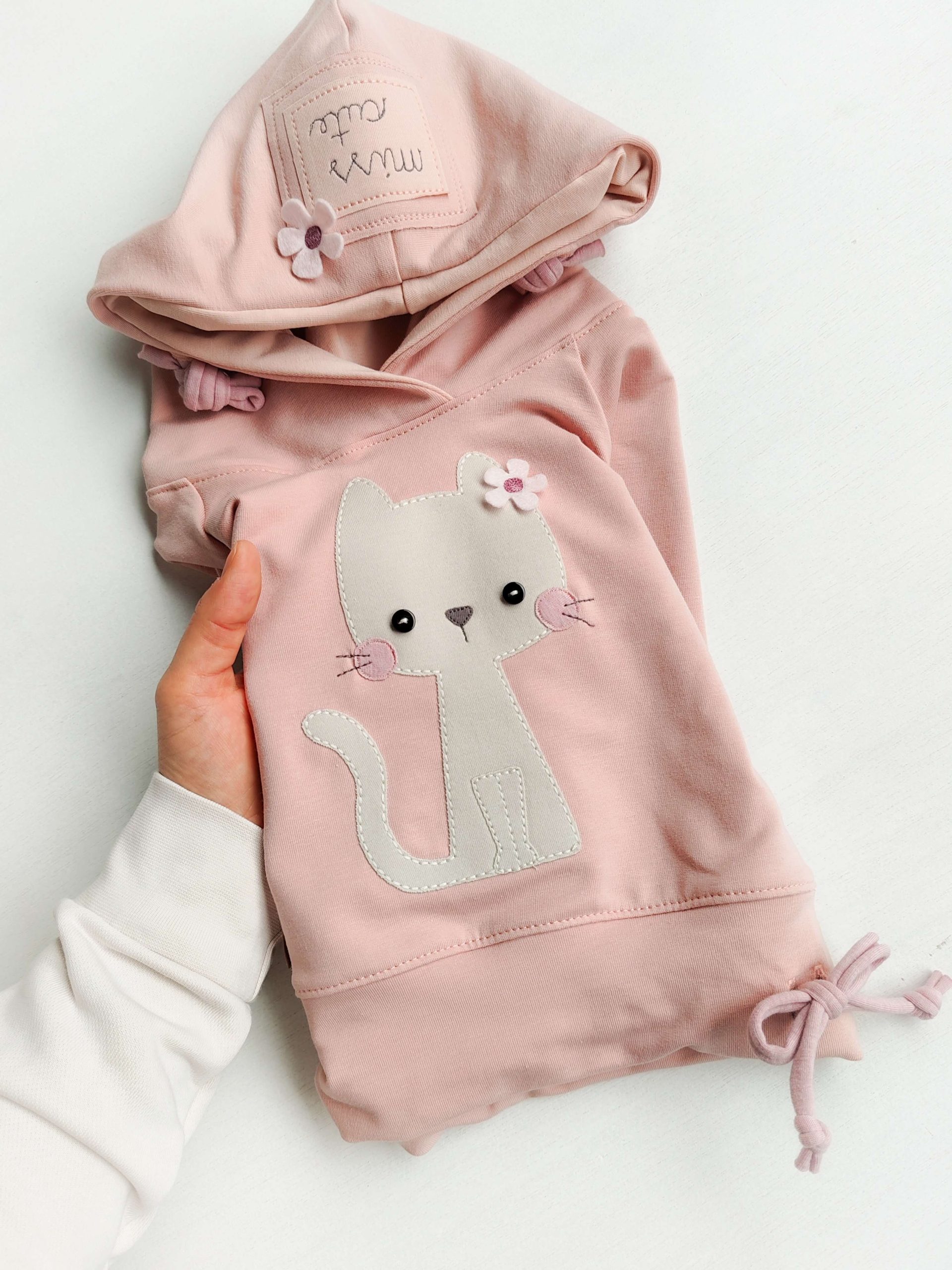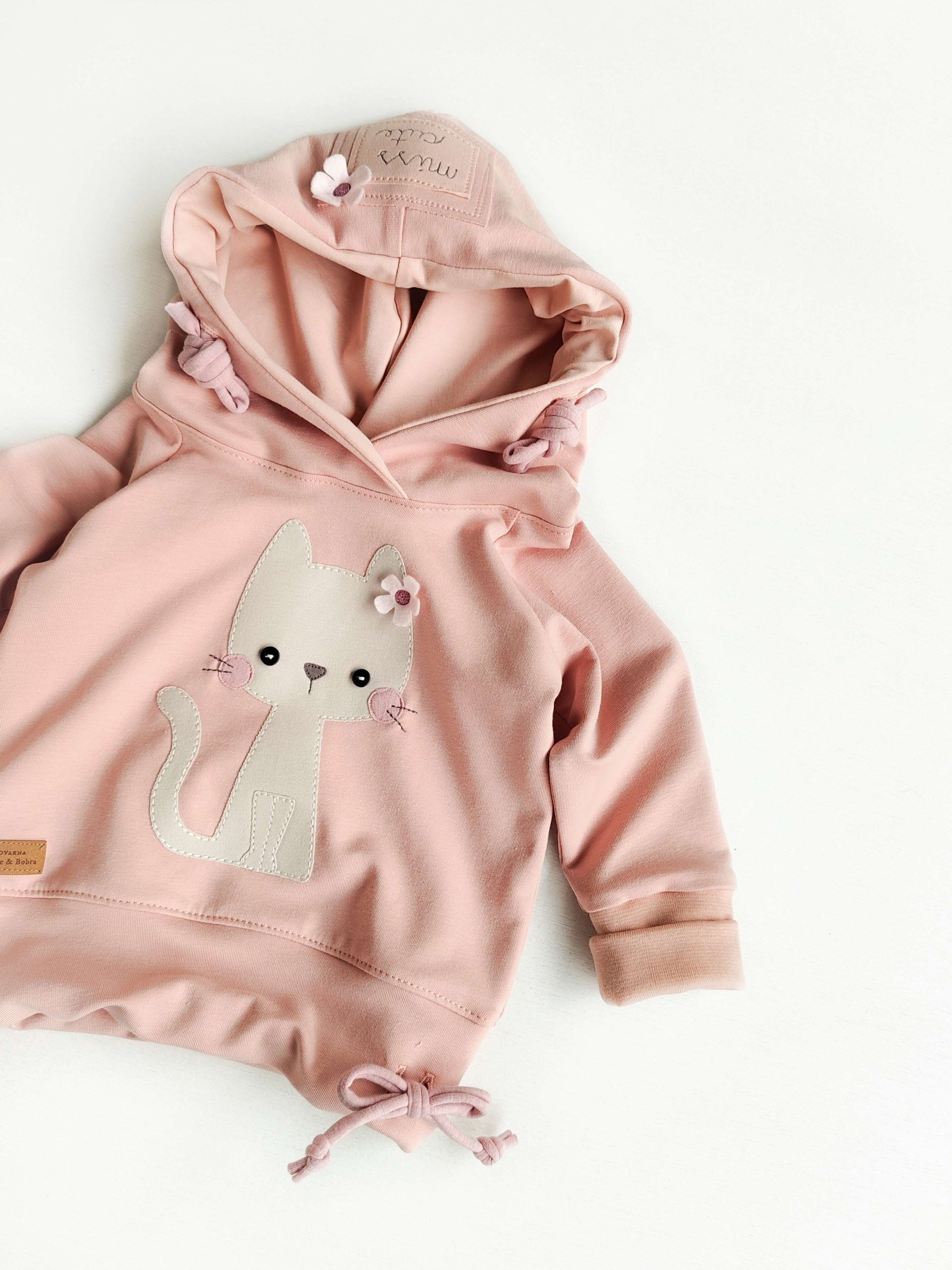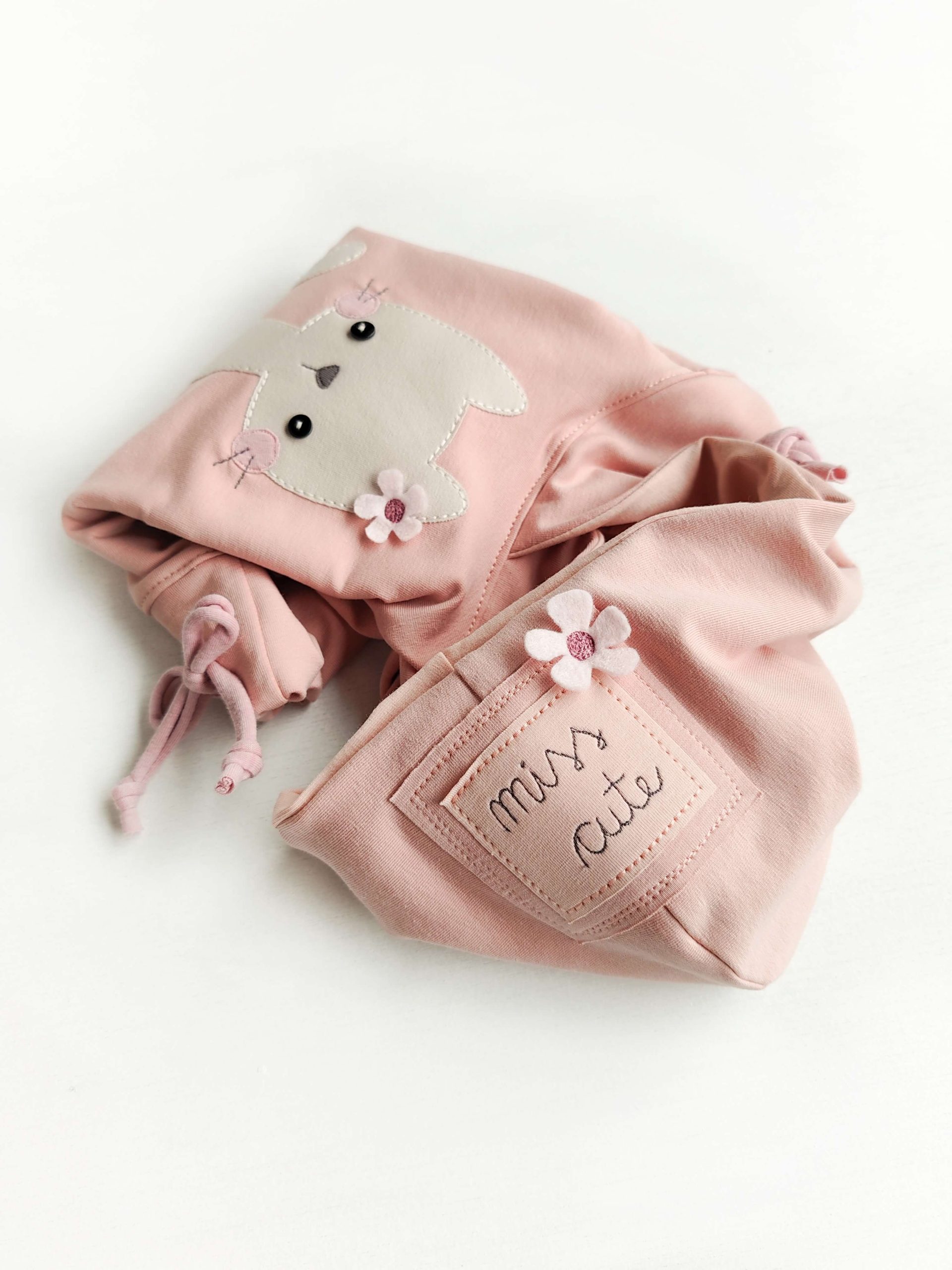 Udoben kapucar v lepi vijolični barvi na sprednji strani krasi ljubka mucka, na kapuci pa prostoročno zašit napis “miss cute”.